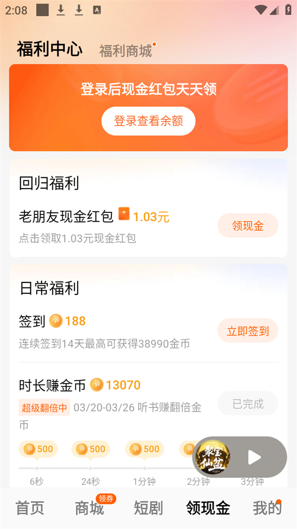 2、听书也能赚钱,听书的同时达到一定时长,系统会奖励您相应的金币,金币可以兑换成现金,提现秒到账。