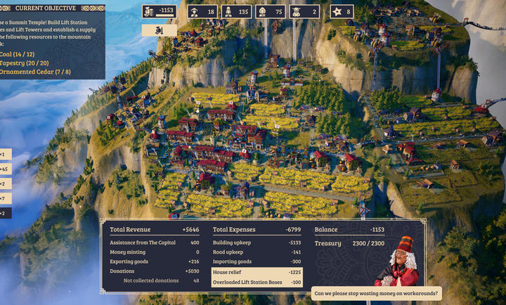 当你在恶劣环境中求得生路,精心建立起高效的运输网络,又能满足镇民的需求后,唯一的挑战便是:征服巅峰!为了实现这项伟业,你需要建立一条安全道路,将大量资源送往山顶。请千万小心——山顶是偏远的危险地区。不过努力终将得到回报,因为建造顶峰圣殿是人类战胜自然的终极象征!