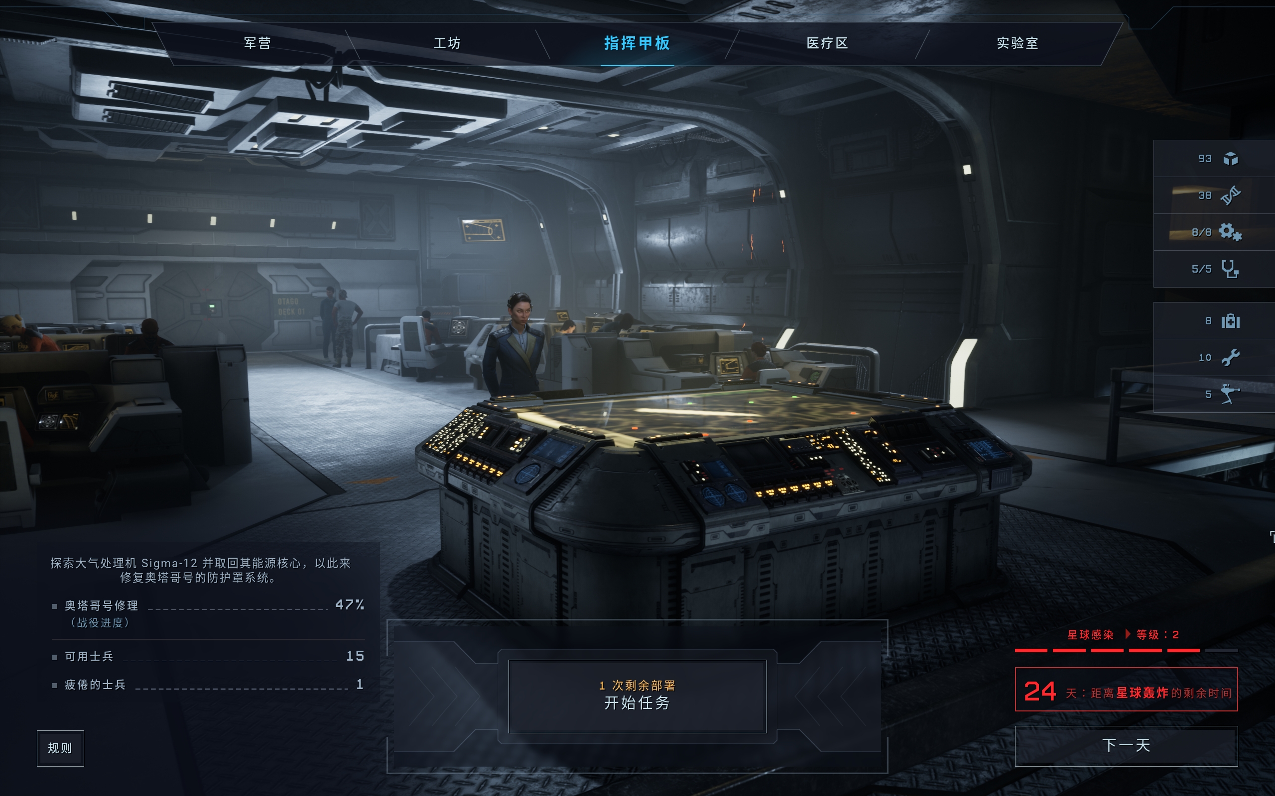 游戏分为两个部分,一个是在非执行任务时玩家处于一艘殖民地陆战队战舰上的运营部分,一个是派遣一支小队前往星球地表执行任务的部分。在战舰上时,玩家可以升级士兵,解锁装备,让刚刚完成任务的士兵休息或者得到治疗,收集分配物资,并使用在上次任务中收集的异形样本来解锁新的有利于对抗异形的科技。然后在做完这一切之后,点击“下一天”按钮,静静等待事态的发展。