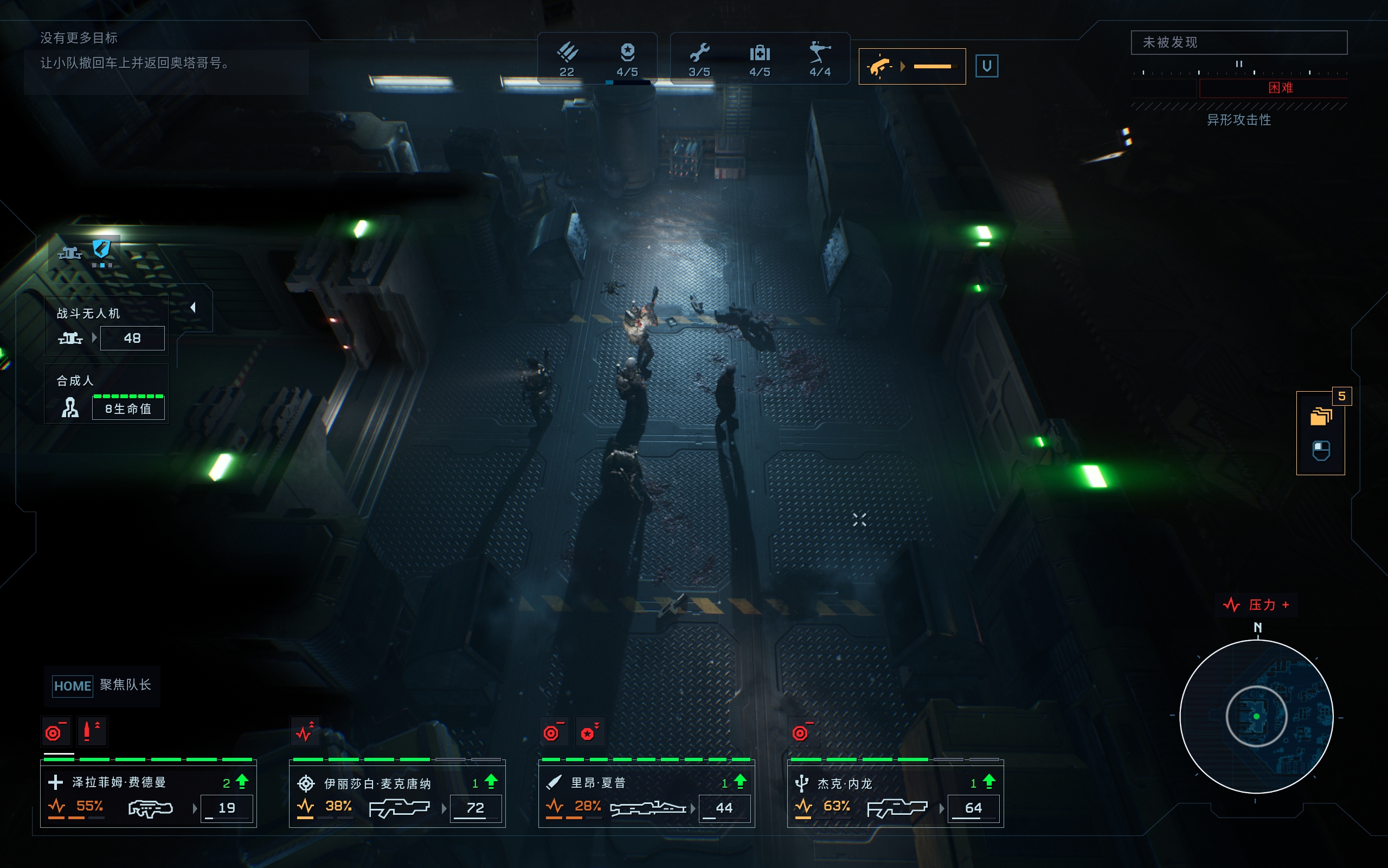 与其他游戏不同的是,你的小队并不是冷酷无情的战争机器,当遭遇异形、经历战斗甚至只是在雷达上看见大量的移动目标都会让士兵感受到压力。