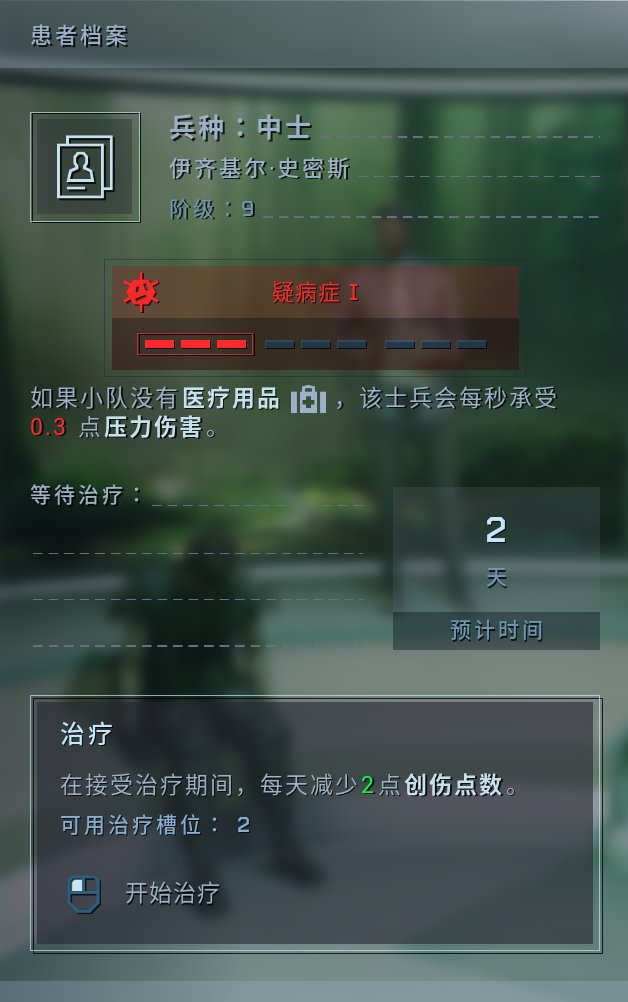 压力分为三个等级:焦虑-惊慌-恐惧,当士兵的压力上升至一定程度,会导致你的士兵出现负面效果,并使他们变成话痨。而在任务结束时,你的士兵在任务中达到的最大压力级别会转化成心理创伤,也就是PTSD,会产生如“恐人症”、“妄想症”、“强迫症”等症状,并干扰他们执行任务,只有在游戏后期解锁的精神护理部可以进行治疗。