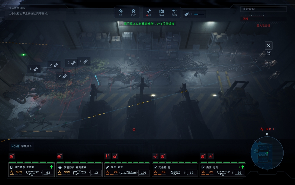 随着游戏进度的推进,你会发现你的小队变得越来越强,当你为士兵解锁了足智多谋这一特质后,弹药便已经不是问题了,你的士兵会每休息一次便增加1个弹药,而游戏还有个特性(不知道是不是BUG),当你在创造了一个安全屋并进行了一次休息后,此时游戏便创建了一个存档,这时你读档,便会发现,你的士兵在已经休息一次的情况下可以再一次休息,周而复始,你便拥有了一个可以无限刷新弹药、命令点数以及降低压力值的办法,同时,游戏内的运动追踪器是通过消耗命令点数来部署的,其有一个能力是过载摧毁自己来吸引全图的异形,我们便可以利用这个特性在一个安全屋内部署非常多的运动追踪器来无限的溜异形。
