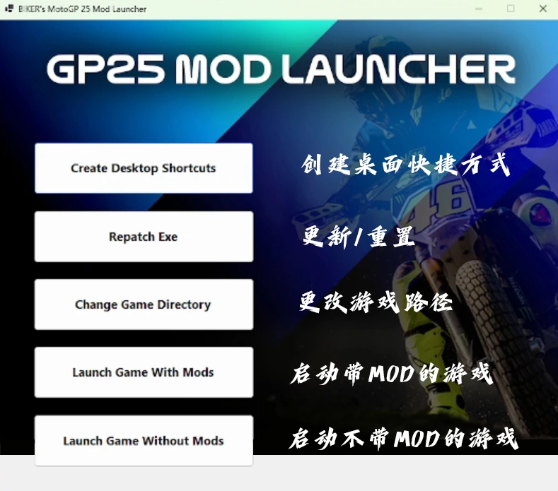 打开BIKER's MotoGP 25 Mod Launcher v1.1 文件夹,并找到MGP 25 Mod Launcher应用程序图标,如下图: