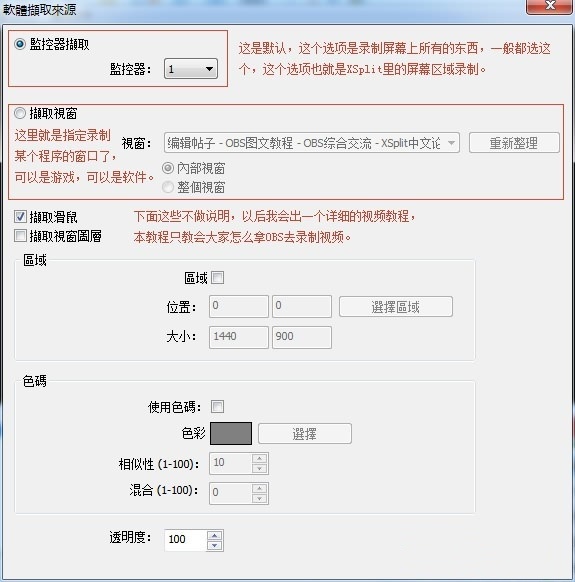 3)看一下上面的图片注释,默认即可点击确定,就可以添加屏幕录制区域了。