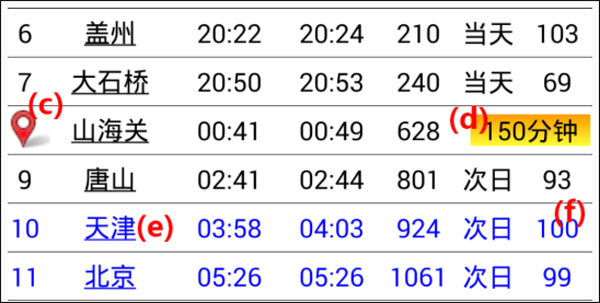 (e)蓝色字体的车站表示车次的运行区间。如:查询“天津”到“北京",两站之间所经过的车站均为蓝色。
