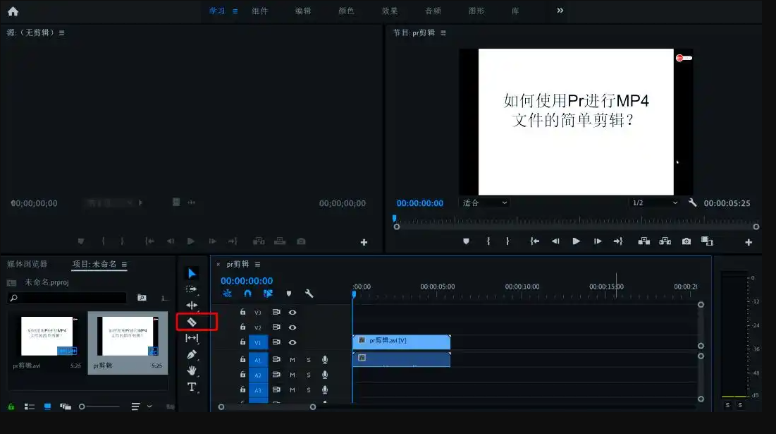 将待剪辑的视频文件直接拖拽至Pr软件的工作区域,即可开始进行视频的剪辑工作。在此过程中,使用【剃刀工具】对视频进行精确切割非常重要,这样能使视频被划分为独立的部分,便于后期编辑和操作。