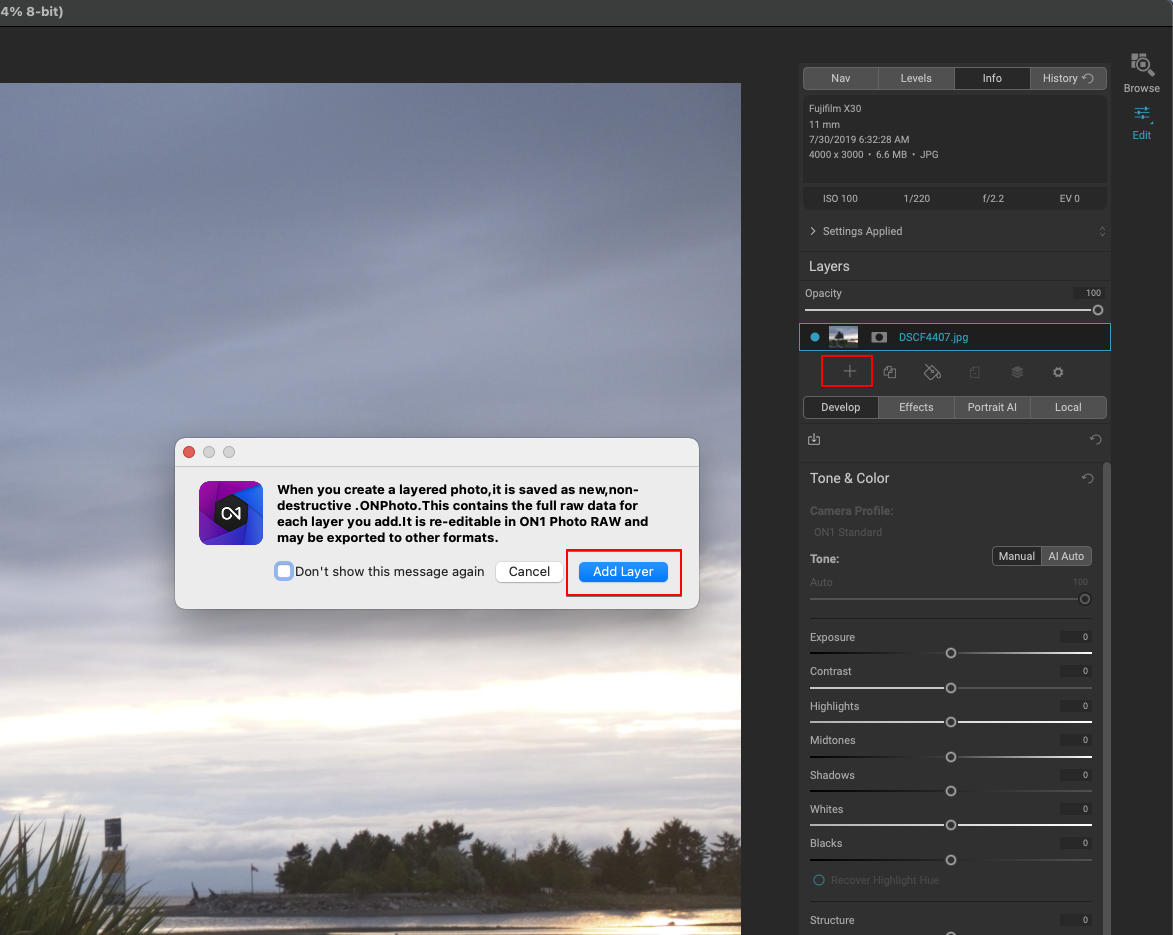 在编辑模块中打开一张图片,然后单击图层窗格中的 + 按钮,然后在弹出的对话框中单击添加图层。