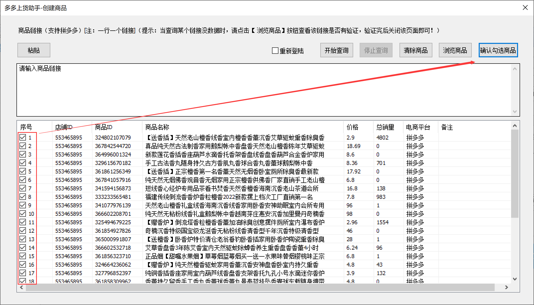 勾选想要复制的商品,并点击“确认勾选”,默认为全选。