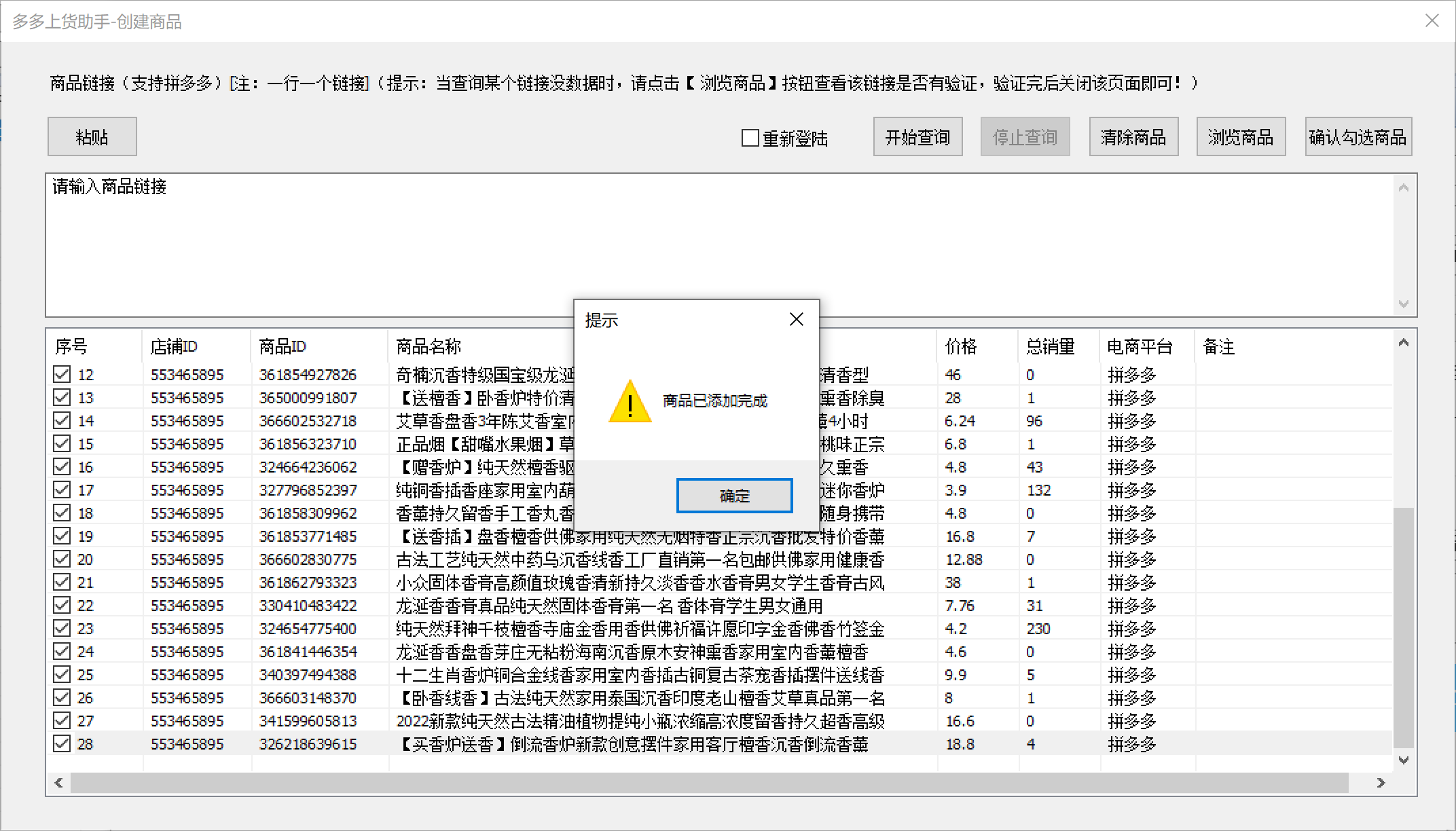 通过自动分析,以下显示该店铺的所有商品链接,并显示“商品已添加完成”的提示,点击“确定”。