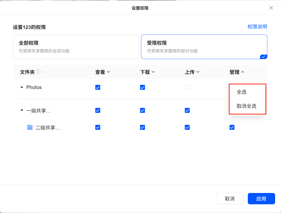 添加的普通用户可以查看共享图库,但具体操作权限则由管理员对每个文件夹的权限设置决定。管理员可以单独设置或通过全选和取消全选来批量设置以下权限: